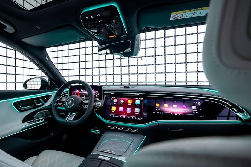 تأتي الفئة إي E مزودة بشاشة عرض رقمية قائمة بذاتها وشاشة وسائط مبوكس MBUX مدمجة في لوحة القيادة. ولكن يمكن توسيع شاشة لوحة القيادة هذه اختياريًا لتشمل شاشة عرض للركاب أعلى صندوق القفازات.